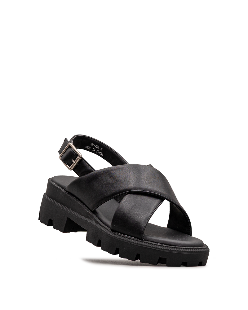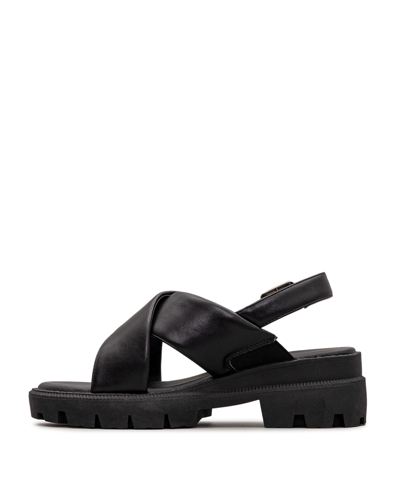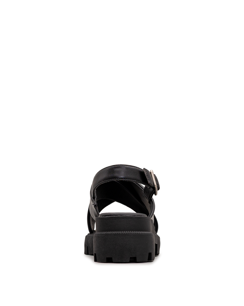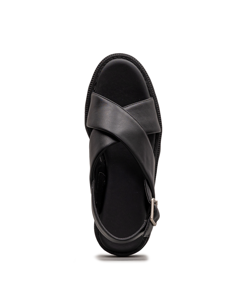 Ces sandales Bloom & Co noires allient allure contemporaine et solidité. Leurs brides croisées et leur boucle réglable assurent un maintien fiable. La semelle crantée ajoute une touche audacieuse tout en garantissant une marche stable. Parfaites pour un look moderne et décontracté.