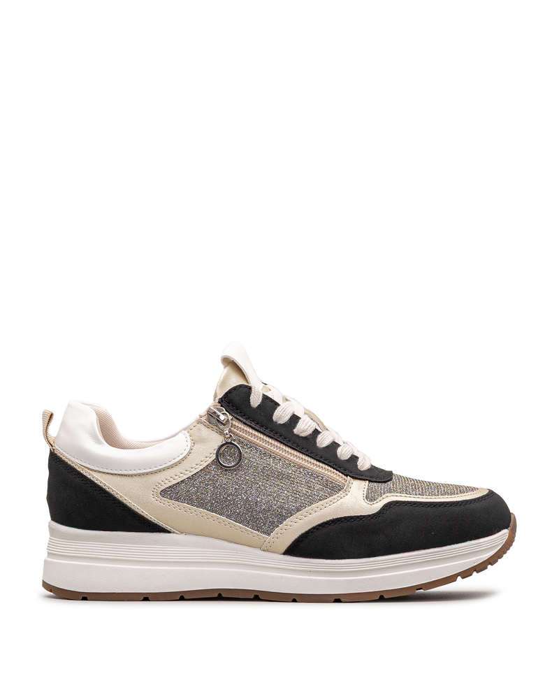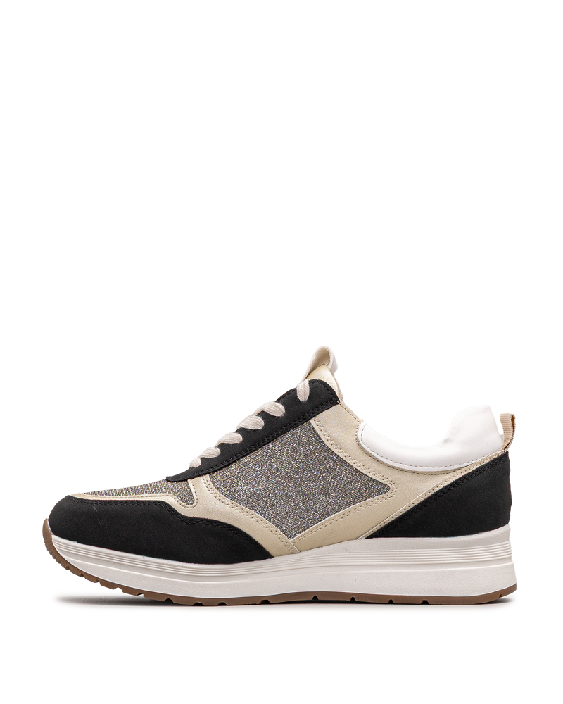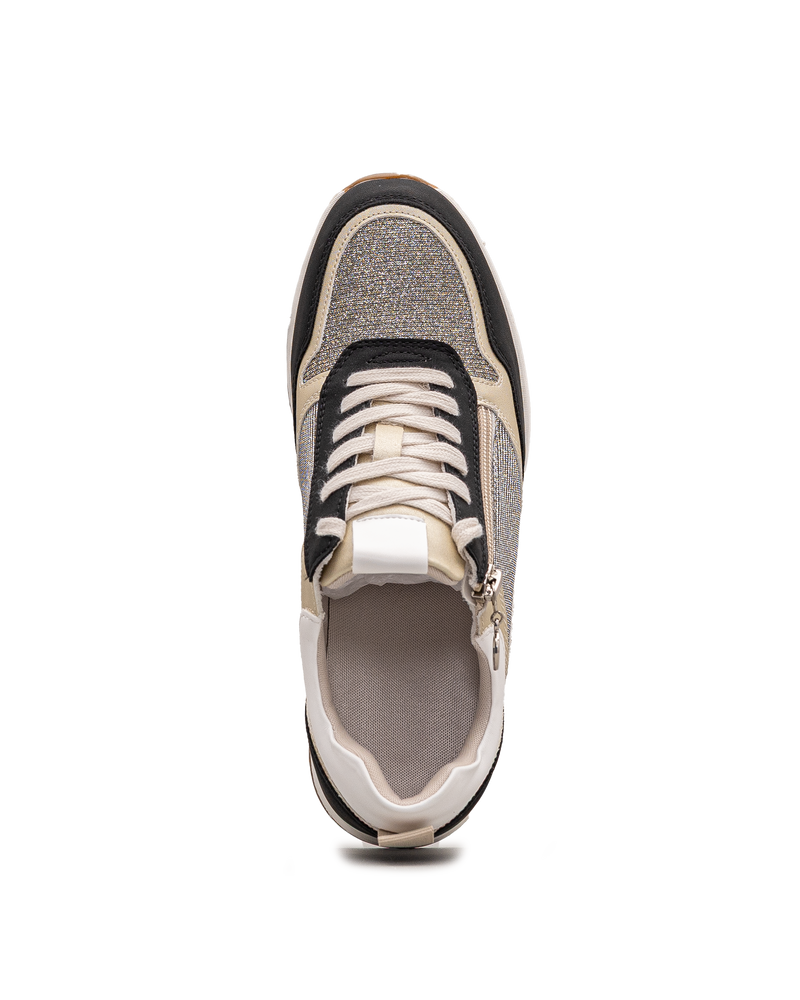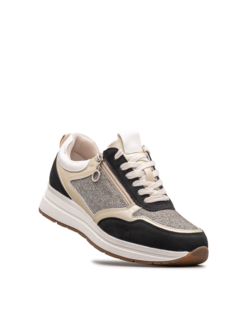 Ces chaussures Bloom & Co noires marient style raffiné et inspiration sportive. Leur texture scintillante rehausse chaque tenue d’un éclat subtil. Dotées d’une fermeture éclair pratique et d’un laçage classique, elles assurent un chaussant facile et ajusté. Un choix idéal pour les femmes recherchant un confort élégant au quotidien.