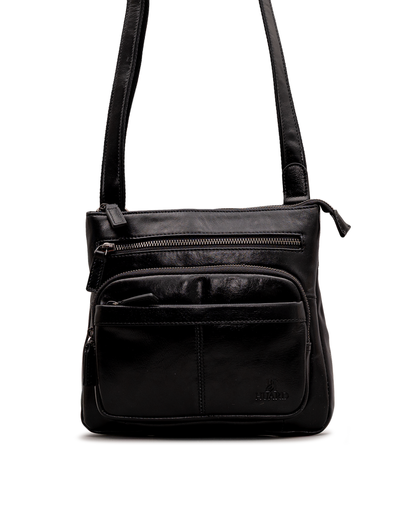 Ce sac Huard noir en cuir souple allie fonctionnalité et style discret pour le quotidien. Ses deux fermetures éclair frontales facilitent l'accès au compartiment principal, tandis que la poche avant zippée avec sous-poches permet d'organiser les essentiels à portée de main. La bandoulière réglable assure un port confortable, que ce soit à l'épaule ou en travers du corps. Un sac bien pensé, pratique et élégant, qui s'intègre facilement à toutes les tenues.