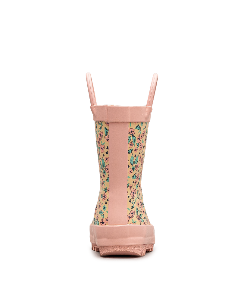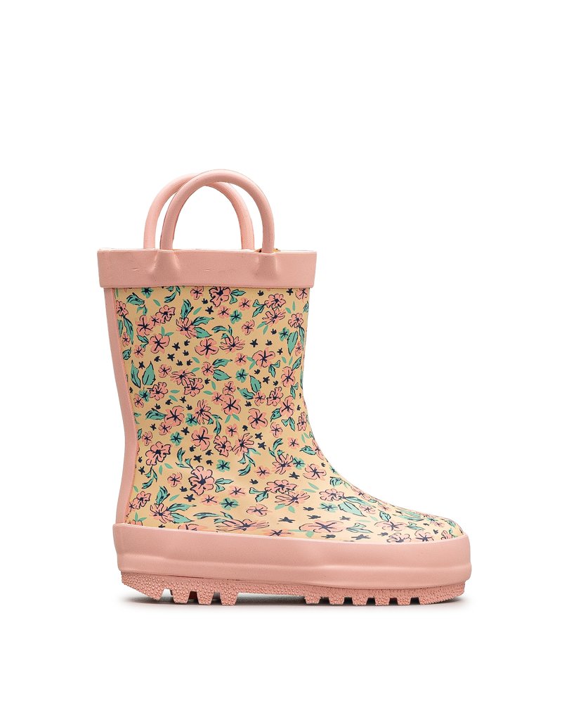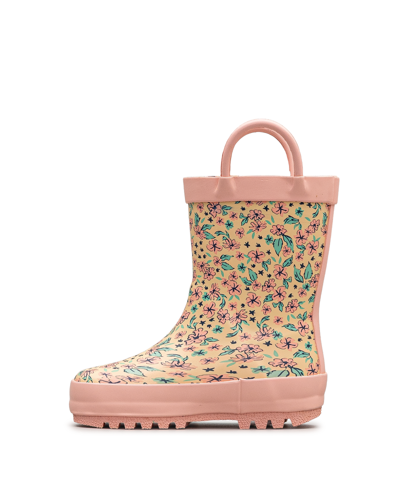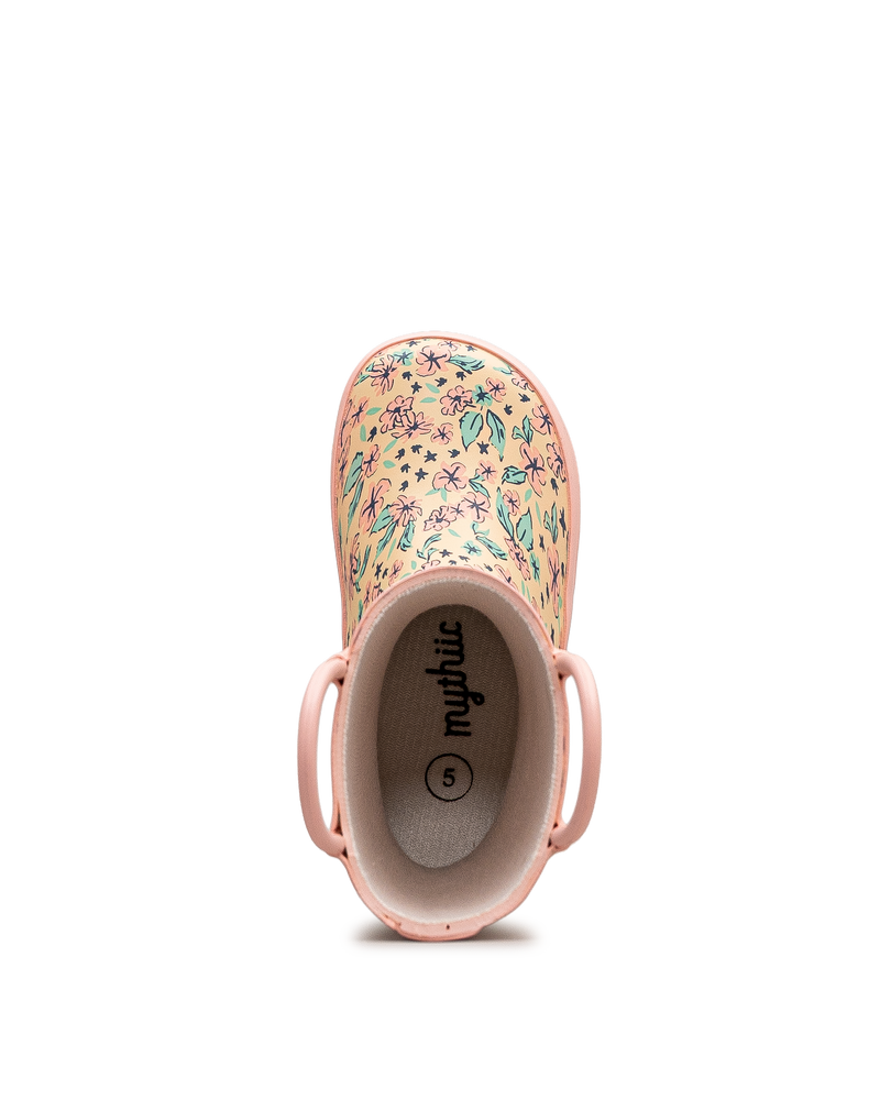 Cette botte de pluie Mythiic beige se pare d'un motif floral coloré qui égaye les journées pluvieuses. Ses poignées roses facilitent l'enfilage pour les tout-petits. La semelle crantée offre une traction sécuritaire sur les surfaces glissantes. Son design impérméable garde les pieds au sec lors des jeux extérieurs. Un modèle charmant qui combine protection et fantaisie.