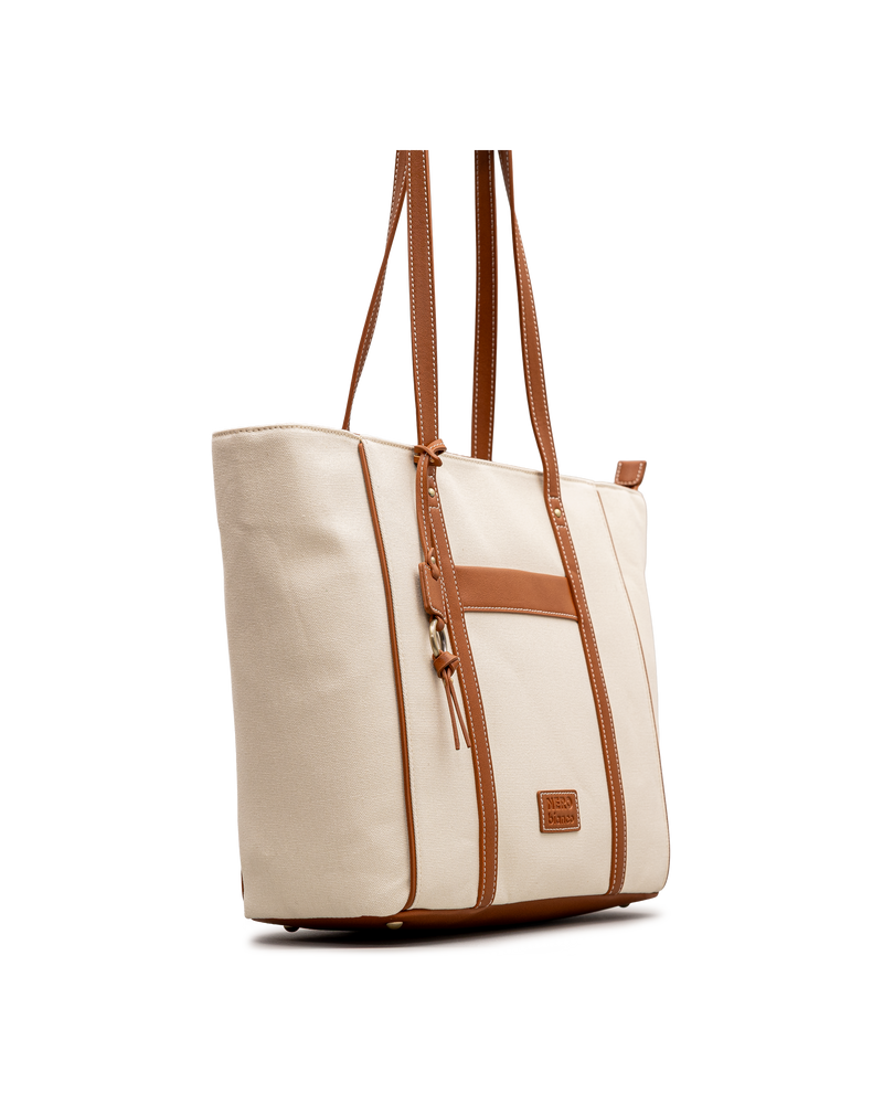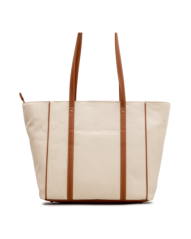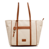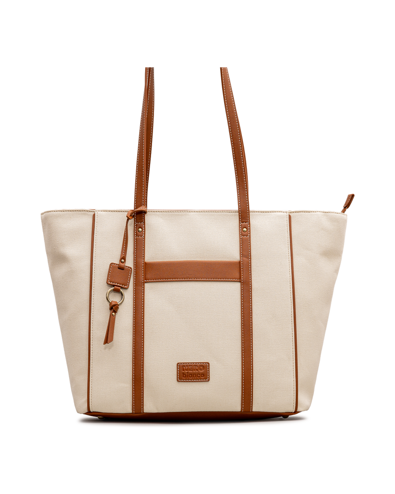 Ce grand sac ivoire Nero Bianco en toile texturée se distingue par ses garnitures et anses synthétiques cognac avec surpiqûres contrastantes. La bande horizontale cognac en façade et la poche frontale ouverte ajoutent structure et fonctionnalité. La fermeture éclair sur le dessus sécurise le contenu, tandis que le porte-clés avec pompon apporte une touche décorative. La plaque logo Nero Bianco est fixée en façade. Spacieux et polyvalent, il est idéal pour le quotidien ou les escapades.
