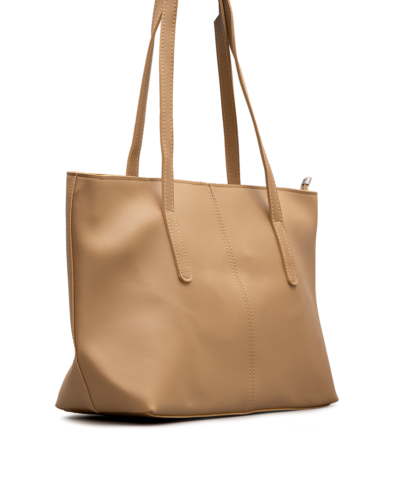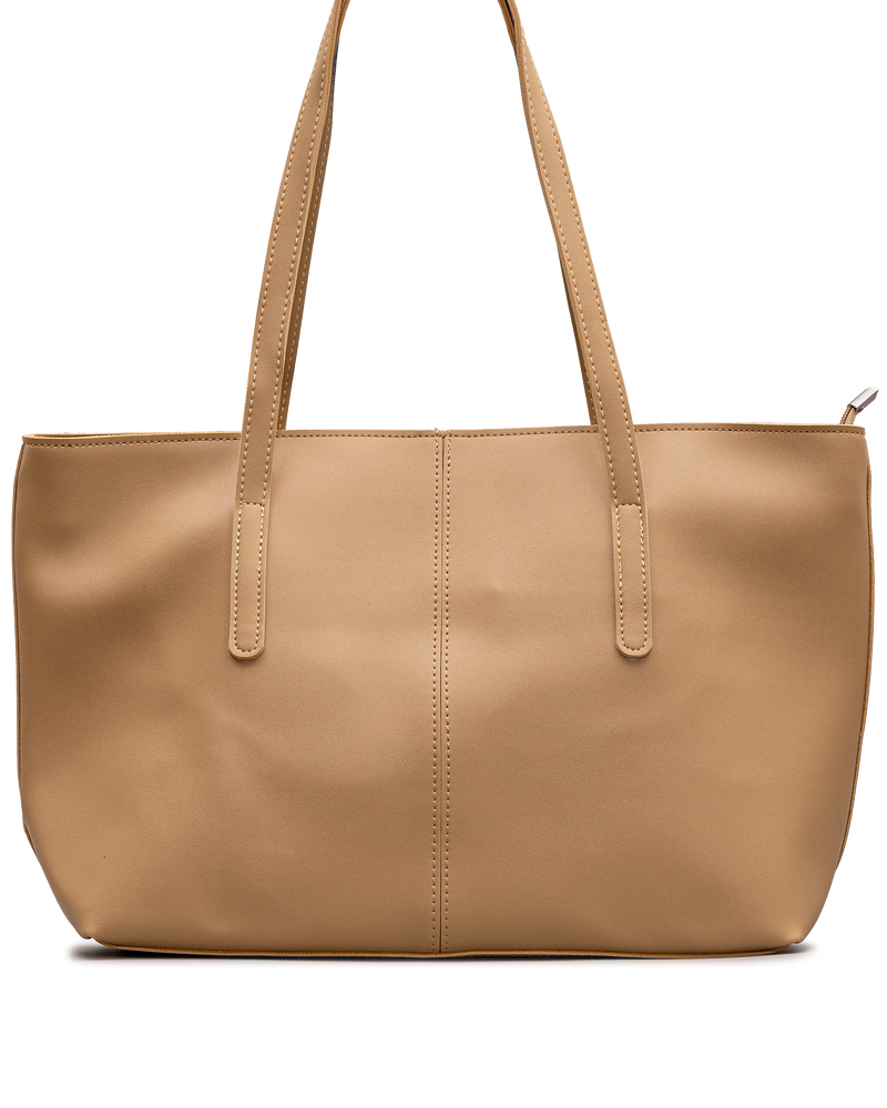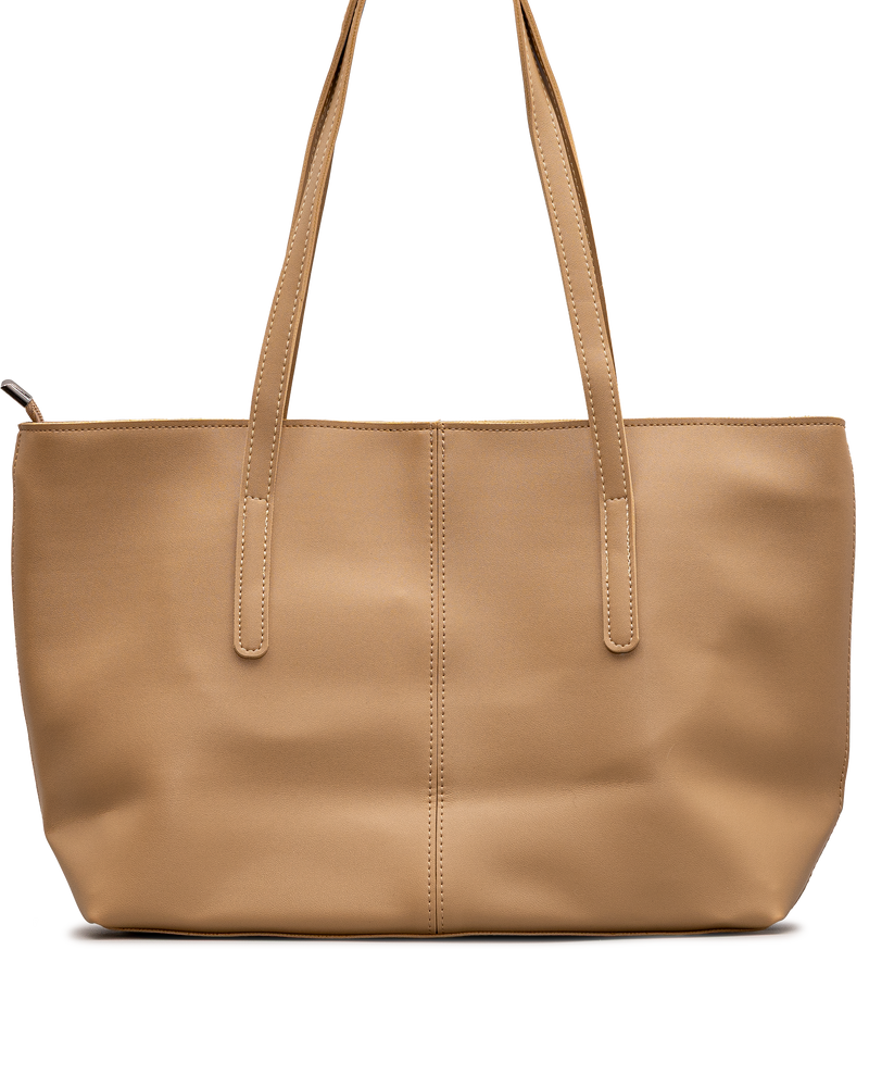 Ce sac tan Nero Bianco pour femme séduit par sa silhouette structurée et son design épuré. La double anse longue aux surpiqûres contrastantes assure un port à l’épaule confortable et élégant. La couture centrale verticale sur la face avant apporte un détail architectural subtil qui distingue ce modèle. Le coloris tan camel polyvalent s’associe à toutes les tenues, du quotidien au bureau. Un sac spacieux et raffiné qui allie style et praticabilité.
