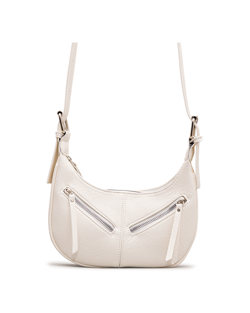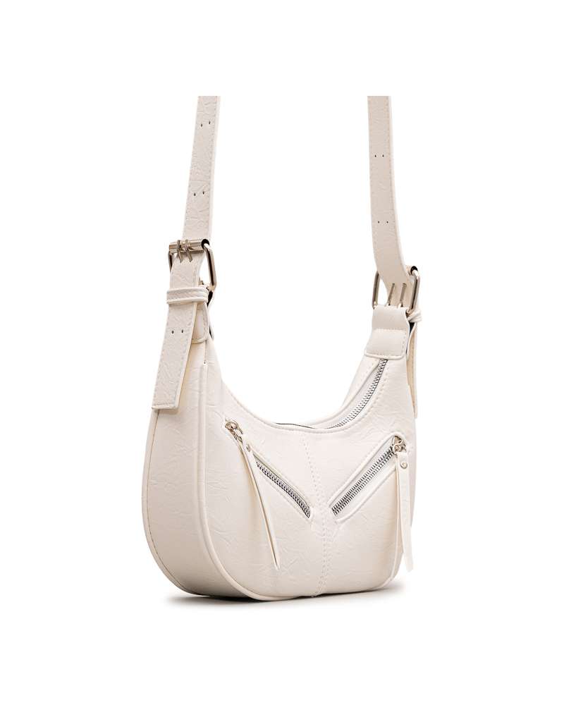 Ce sac ivoire séduit par son design structuré avec fermetures éclair décoratives en V. Les détails métalliques ajoutent une touche de raffinement au look urbain. La bandoulière ajustable assure un port confortable en bandoulière. Nero Bianco crée ici un accessoire polyvalent qui marie fraîcheur lumineuse et caractère affirmé, parfait pour les femmes qui aiment un style décontracté avec une pointe d'originalité.