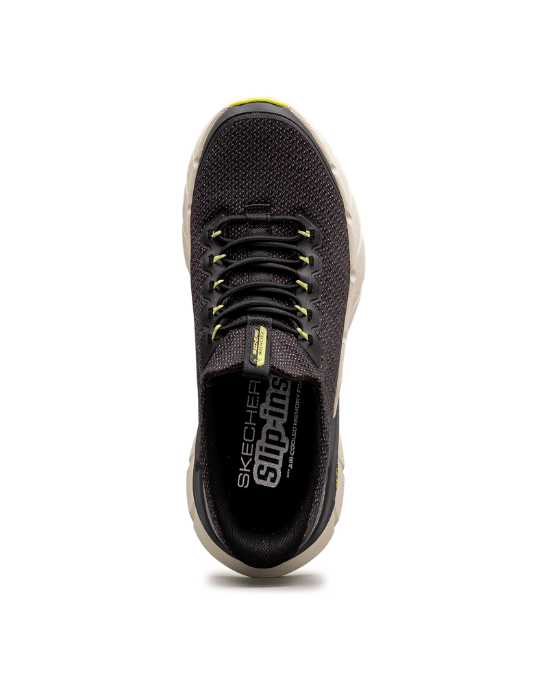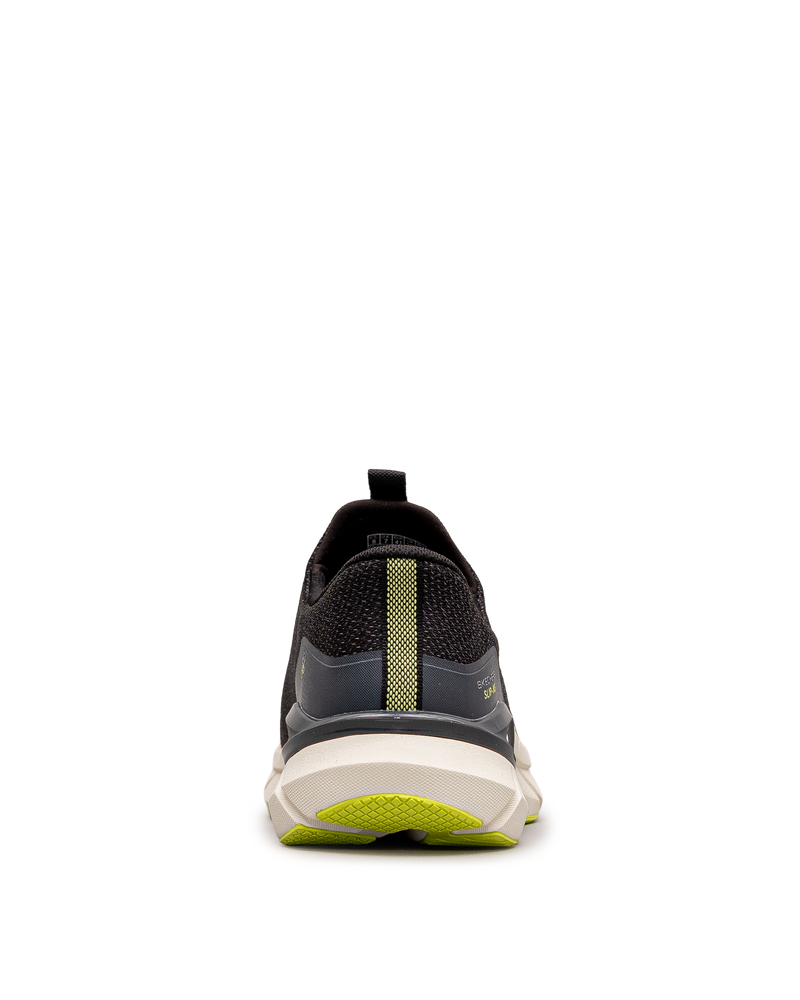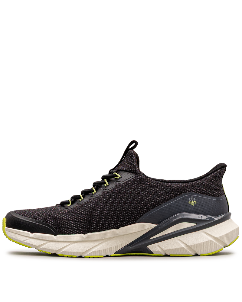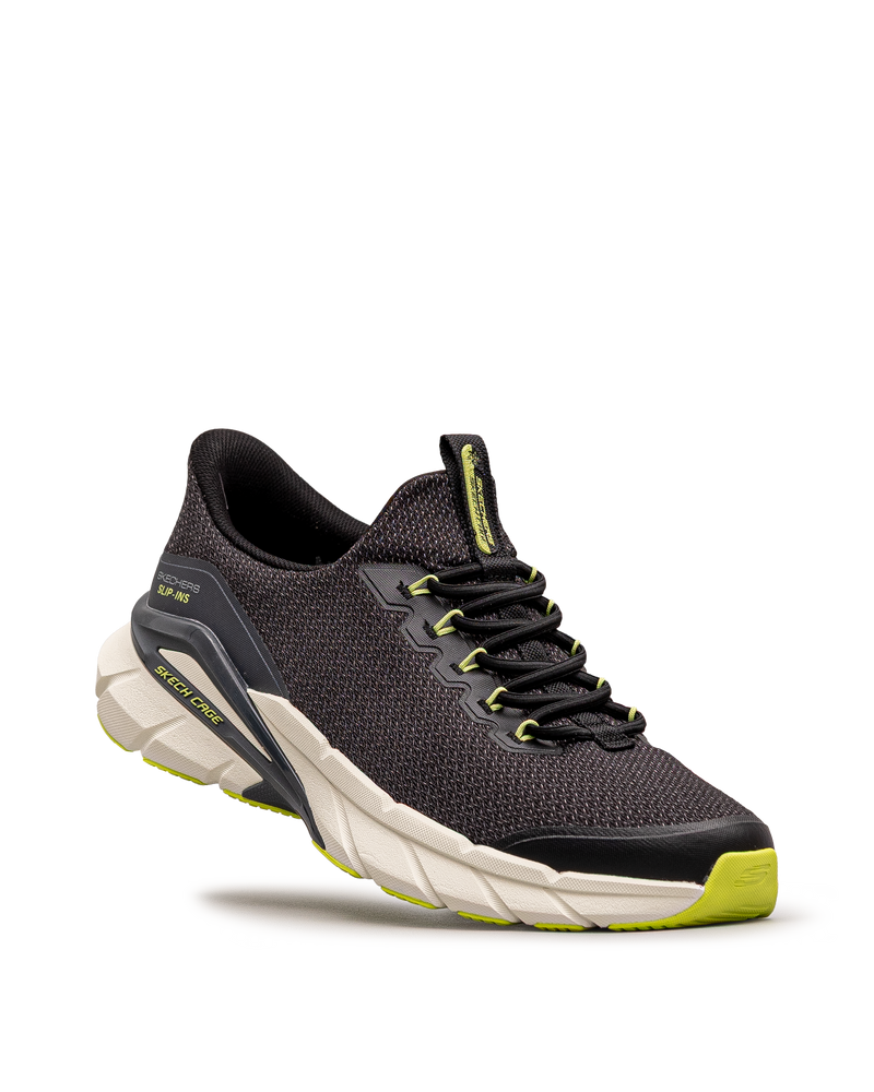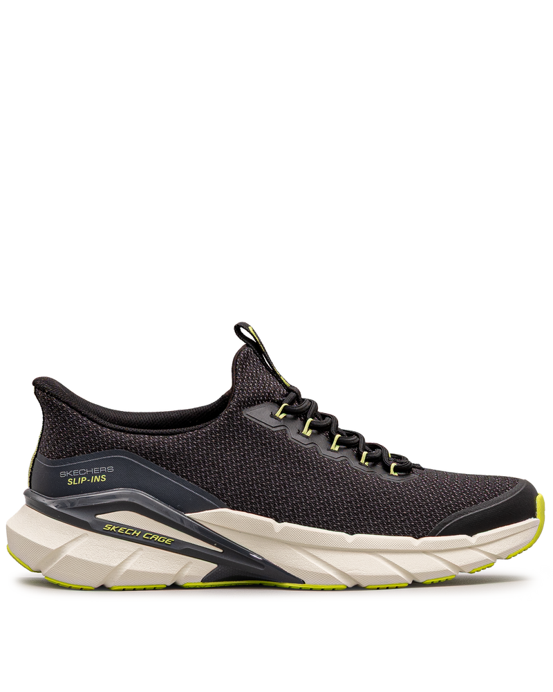 Ces chaussures noires Skechers pour homme affichent un style sport technique affirmé grâce à la semelle Skech-Cage bicolore blanc cassé et noir à la structure sculpturale distinctive. La tige en mesh textile ultra-aéré assure une excellente ventilation, tandis que la technologie Slip-ins et les lacets bungee aux passants jaune lime permettent un enfilage rapide et sans effort. Le bout de semelle jaune lime apporte une touche colorée dynamique qui signe le modèle avec caractère. Un amorti généreux pour les longues journées actives.