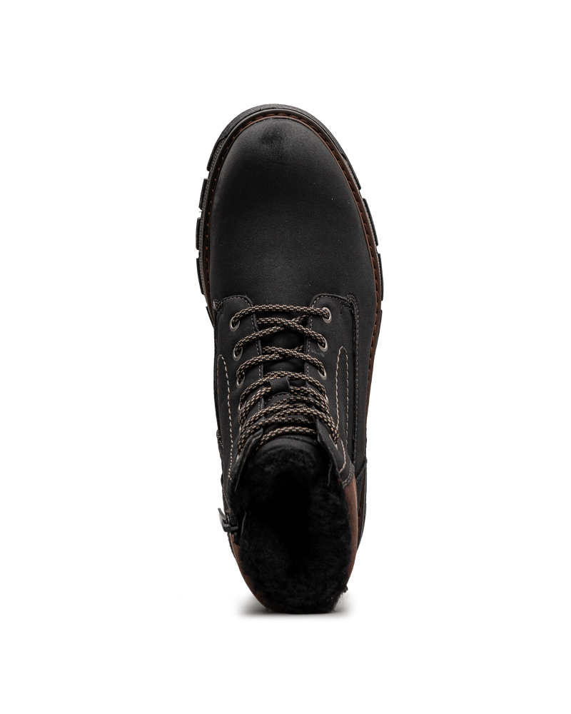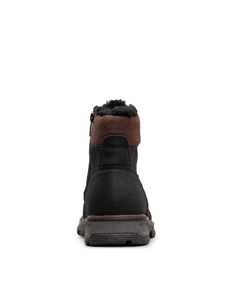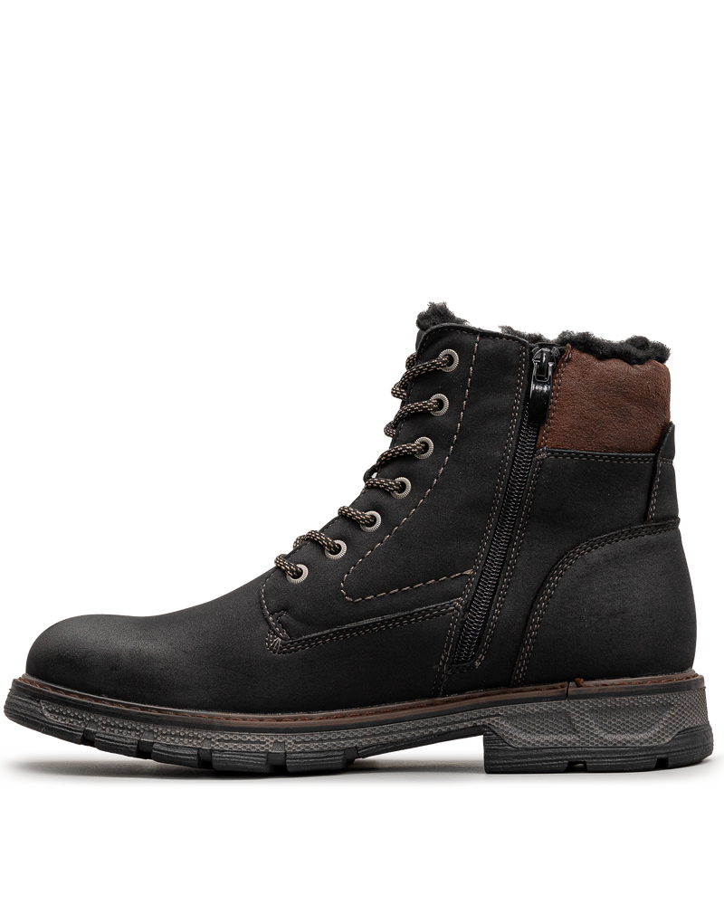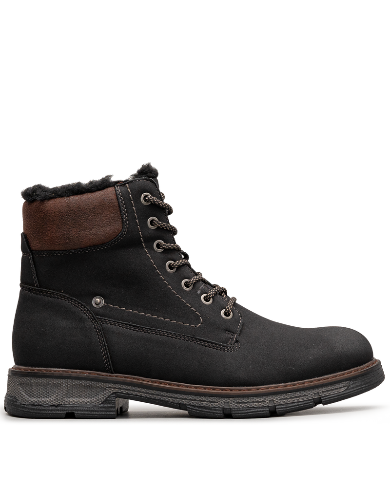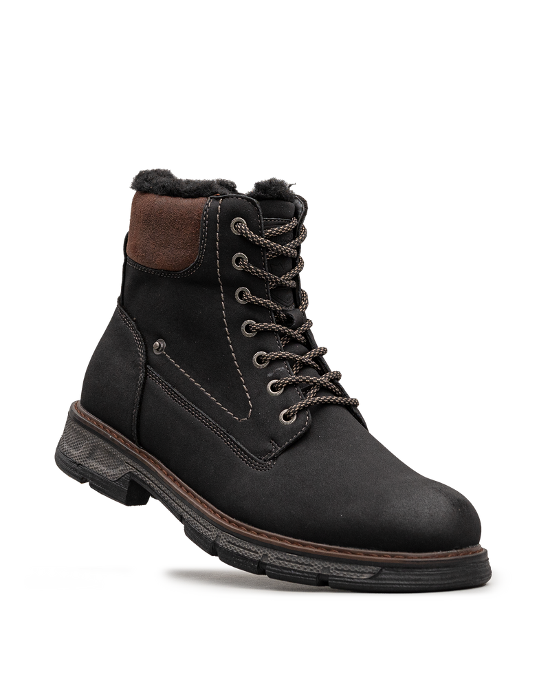 Ces bottes pour hommes, fabriquées en cuir vegan noir rustique, allient style et robustesse. Conçues pour résister aux intempéries, elles sont doublées d’un matériau isolant qui vous garde au chaud durant les mois d’hiver. Le col rembourré et la semelle épaisse assurent un confort optimal pour de longues marches, tout en apportant un style décontracté et élégant à votre look quotidien. Les détails de coutures apparentes ajoutent une touche artisanale, et les lacets bicolores renforcent leur allure intemporelle. Parfaites pour les sorties en ville ou les escapades en pleine nature, ces bottes sont un incontournable pour la saison froide.