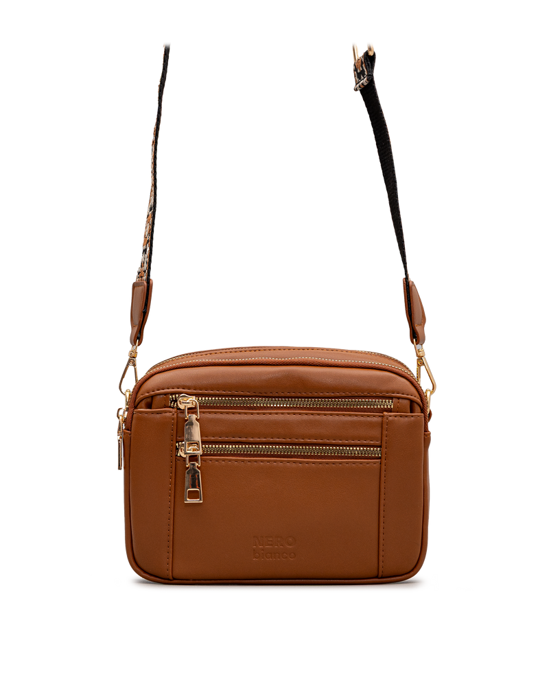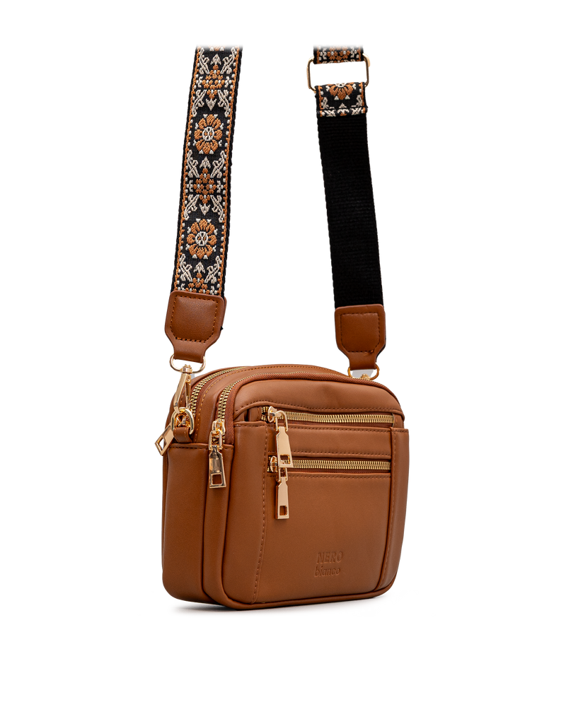 Ce sac bandoulière tan Nero Bianco combine style raffiné et praticité au quotidien. Ses multiples poches à fermeture éclair permettent une organisation optimale. Sa bandoulière large et décorative ajoute une touche tendance et assure un confort supérieur. Un accessoire polyvalent qui rehausse vos tenues avec élégance.